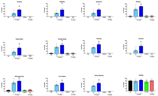 The following are available online at https://www.mdpi.com/article/10.3390/ph14101034/s1, Figure S1: FWL at 30 min after morphine 2.5 mg/kg (M2.5), YHS (250 mg/kg), and morphine +YHS (M2.5+YHS) over a period of 7 days (n = 7–11, i.p. administration) to display tolerance. Two way ANOVA revealed significant drug tolerance of morphine (M2.5) over 7 days (D) F (6, 168) = 7.023 p < 0.0001, followed by Tukey’s multiple comparison test. Two way ANOVA revealed significant analgesic effects between M2.5, YHS 250, and M2.5+YHS F (6, 168) = 7.023 p < 0.0001, followed by Tukey’s multiple comparison test M2.5*** p < 0.0001 compared to YHS on D1–7, YHS ### p < 0.0001 compared to M2.5 + YHS on D1–7, M2.5 $$$ p < 0.001 compared to M2.5 + YHS on D1–7., Figure S2: Jumping, writhing, head shakes, genital licking, body grooming, face wiping, teeth chattering, dysphoria, rearing, chewing, diarrhea, sniffing after naloxone i.p. administration (n = 7). One way ANOVA revealed significant percentage of jumping, writhing, head shakes, genital licking, body grooming, face wiping, teeth chattering, dysphoria, rearing, chewing, and diarrhea in animals treated with morphine only, F (3, 24) = 81.05 p < 0.0001, followed by Tukey’s multiple comparison test, *** p < 0.0001, M2.5*** p < 0.0001 compared with M2.5-YHS and M2.5-M2.5 + YHS.