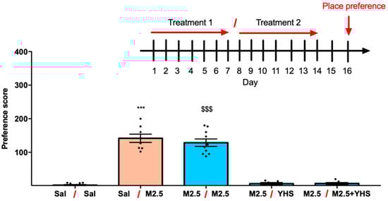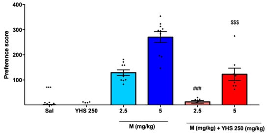 Reward-related behavior was monitored in the CPP paradigm. A preference score was determined by observing the time that each animal spent in the drug-paired chamber vs. the saline-paired chamber during the pre- and post-training periods. As shown in Figure 4, M2.5 and M5 induced strong preference scores (100 and 250, respectively), indicative of addiction and the associated drug-seeking. When YHS 250 was added to M2.5 or M5 during the training, preference scores decreased strongly, showing that YHS is able to significantly limit the rewarding effects of morphine.