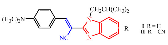 By using uncatalyzed microwave-assisted amination in acetonitrile with an excess of desired amine, N-substituted precursors 3–8 bearing i-butyl, methyl, phenyl, and n-hexyl substituents were obtained in good reaction yields. Within the reduction of nitro-substituted compounds 3–8 with SnCl2·2H2O in MeOH followed by cyclocondensation with 2-cyanoacetamide at high temperatures, corresponding N-substituted 2-(cyanomethyl)-benzimidazoles 17–25 as main precursors were obtained in moderate yields [27]. Targeted acrylonitrile derivatives 32–71 were synthesized in the condensation with the chosen unsubstituted and methoxy-, N,N-dimethyl-, and N,N-diethyl-substituted aromatic aldehydes 26–31 in absolute ethanol by using a few drops of piperidine as a weak base. All acrylonitriles were obtained in moderate to high reaction yields, while some of them were obtained as mixtures of E- and Z-isomers (38, 41, 45, 61, 64, 67, and 68), which could not be efficiently separated by column chromatography.