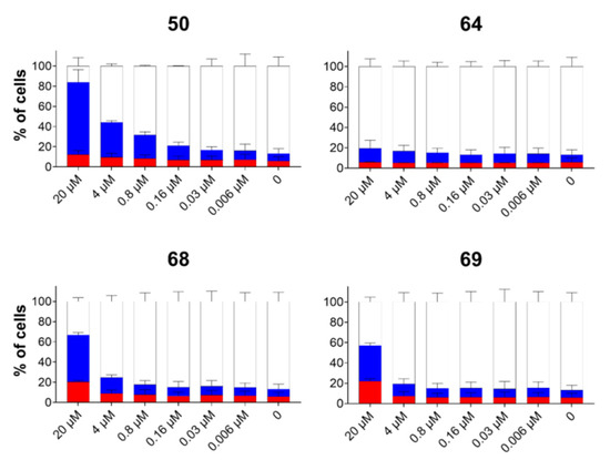 Effects of derivatives 50, 64, 68, and 69 on normal PBMC. Apoptosis induction in PBMC from two healthy donors was determined by staining with IncuCyte® Caspase 3/7 Green Reagent and PI followed by live cell monitoring. The percentages of live (white), dead (red), and apoptotic (blue) cells after 72 h are shown (means ± standard error bars).