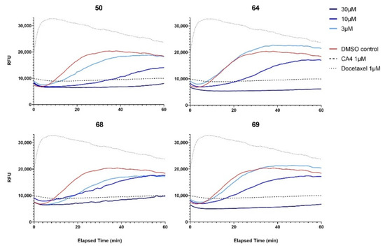 At the highest concentrations tested (30 and 10 µM), these four derivatives were all able to inhibit tubulin polymerization. Even when lowering the dose to 3 µM, compounds 50 (to a lesser extent) and 68 still showed some inhibitory activity in the in vitro assay.