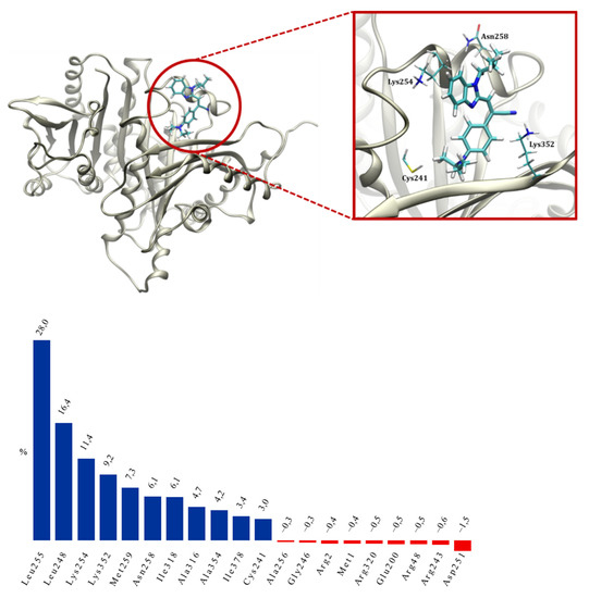 The results presented so far confirm 64 as the most potent ligand and reveal its position within the colchicine binding site as the most favorable binding location. Knowing that it was isolated as a mixture of both isomers, we decided to further support its prevalence for the E-isomer and its likely biological activity through a series of MD simulations considering both isomers. It turned out that when a less stable Z-isomer is placed within the colchicine binding site, it leaves this location after 130 ns of the simulation time, only to remain allosterically bound for the rest of the simulations (Figure S125). The MM-GBSA analysis reveals that during the first part of the simulation, while orthosterically bound, its binding free energy is 2.1 kcal mol−1 lower than during the second part, when it is positioned outside the colchicine binding site, thereby providing the driving force for the departure (Figure S126). On the other hand, its E-isomer remains within the colchicine binding site throughout the MD simulations (Figure S127), while the decomposition of the obtained binding energy into contributions from individual residues demonstrates interesting trends (Figure 6). This confirms the hydrophobic nature of the β-subunit interior and the orthosteric binding site, as Leu255 and Leu248 dominate the binding, being solely responsible for over 40% of the binding energy. This is followed by the mentioned Lys254 and Lys352 residues, which establish hydrogen bonds mainly with the cyano group and the unsaturated benzimidazole nitrogen atom, respectively, with the former occasionally being supported through Asn258 as well (Figure S128).