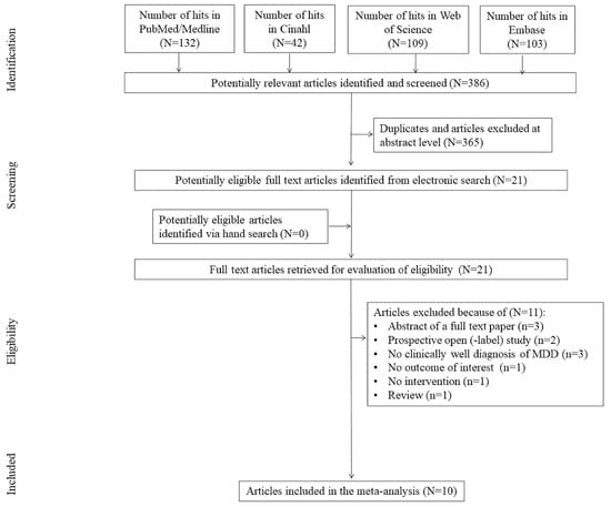 The initial search yielded 386 hits. At first, we excluded 365 studies as for being duplicates and/or after evaluation on the title/abstract level. No additional articles were identified via hand search. Finally, 21 full-text articles were reviewed. Of those, 11 did not fit the inclusion criteria. Primary reasons for exclusion were: abstracts for full-text studies (N = 3), no clinically well diagnosis of MDD (N = 3) and other than a randomized controlled trial (RTC) design (N = 2). We excluded studies being review, with no outcome of interest and no intervention, one per each reason (N = 3). Finally, the search yielded 10 studies that were included in the meta-analysis (Figure 1).