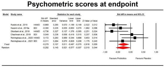 Using random-effects weights, the standardized difference in means (SDM) for symptomatology of depression evaluated by pooled Beck Depression Inventory (BDI) and Hamilton Depression Rating Scale (HAMD) scores at the endpoint was −0.292 with a 95% confidence interval of −0.577 to −0.007 (z = −2.01, p < 0.044; Figure 2).