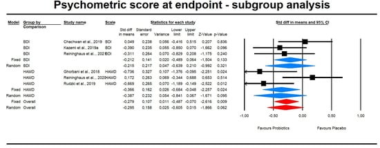 The present review included ten randomized clinical trials [21,22,23,24,25,26,27,28,29,30] that evaluated the effectiveness of probiotics in MDD treatment measured by psychometric scales. In five of them, the mechanism of probiotic action was also examined. The antidepressant efficacy of probiotics in MDD was demonstrated in three studies [21,23,25] and the improvement of cognition in two papers [28,30]. Saccarello et al. [29] reported improvements in symptoms of depression, anxiety and cognition along with somatic components, whilst Reininghaus et al. [26] did not report on any beneficial impact of probiotics in the course of MDD. The meta-analysis showed that particular combinations of probiotics or specific species and strains appear to be beneficial in MDD in terms of their effect on the BDI and HAMD pooled psychometric scales, but it is not possible to draw definitive and conclusive conclusions about their effectiveness. The beneficial effect of probiotics is evident in the analysis using change scores in the subjective BDI scale, the magnitude of which is at the middle level. Additionally, the effect size, DM = 4.85, may be of small clinical importance. The results on the BDI and HAMD psychometric scales measured at the endpoint do not confirm the high effectiveness of probiotics due to the small effect size, small statistical significance and weak clinical effect. In addition, serious heterogeneity was observed between the studies in which the HAMD scale was assessed. From among the meta-analyzes published so far, only two works [16,17] analyzed the effectiveness of probiotics in patients with MDD without comorbidities. A recently published updated meta-analysis [17] found a beneficial effect of probiotics in patients with MDD receiving antidepressants but not with probiotic monotherapy. In our study, it was not possible to distinguish such a subgroup (as we subgrouped studied by the psychometric scales), but it should be emphasized that only one study included in the meta-analysis described the population of treatment naïve patients [30]. Moreover, the inference is made more difficult by the fact that half of the analyzed studies took place in Iran, and five of them were carried out on two patient cohorts, which does not ensure adequate representativeness of the analyzed studies.
