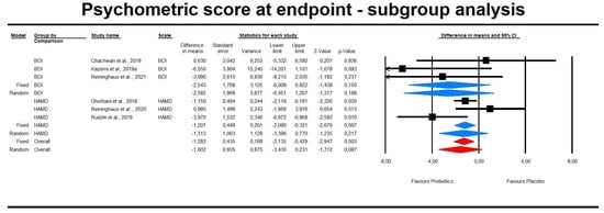 However, subgroup analyses regarding the type of psychometric scale used demonstrated insignificant results (Figure 3). In the case of difference in means (DM), the effect size of probiotic intervention was also insignificant in the case of subgroups analysis (Figure 4).