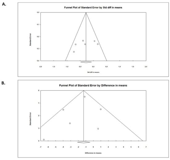 An Egger’s test did not suggest a publication bias regarding the net effect of probiotics on symptoms of depression (Egger’s test:—SMD: p = 0.32;—DM: p = 0.55; (Figure 5).