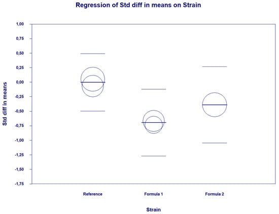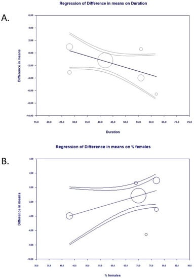 There were some covariates associated with study-level effects of probiotics on depression symptoms for SDM and DM effect sizes and psychometric score at the endpoint. The significant association between effect size (SDM) and probiotic strains (Formula R as the reference group) was found: probiotic strain “Formula 1” coefficient = −0.69, standard error (SE) = 0.27, Z = −2.55, p = 0.01; Probiotic “Formula 2” coefficient = −0.38, SE = 0.29, Z = −1.32, p = 0.18. This covariate explained 100% of the variance in the effect size (Figure 6). Other covariates were not linked to the estimated effect size. Duration of intervention: (a) coefficient = −0.0072, SE = 0.01, Z = −0.65, p = 0.52; (b) % of females: coefficient = 0.01, SE = 0.01, Z = 1.32, p = 0.19; (c) mean age: coefficient = −0.055, SE = 0.14, Z = −0.4, p = 0.69 and (d) mean BMI coefficient = 0.03, SE = 0.06, Z = 0.54, p = 0.58 The estimates in case of DM were as follows: (a) Probiotic strain “R”; coefficient = −6.42, SE = 4,36, Z =−1.47, p = 0.14; Probiotic Strain: Other: coefficient = −1.94, SE = 1.86, Z = −1.04, p = −0.29 (b) duration of intervention: coefficient = −0.12, SE = 0.06, Z = −1.84, p = 0.06 (Figure 7A); (c) % of females: coefficient = 0.1, SE = 0.06, Z = 1.78, p = 0.07 (Figure 7B) (d) mean age: coefficient = −0.70, SE = 0.45, Z = −1.56, p = 0.12 and (e) mean BMI coefficient = 0.88, SE = 0.54, Z = 1.66, p = 0.1.
