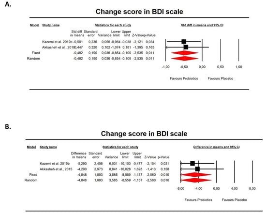 (A). An effect size (random model), SDM, for depression symptoms in BDI change score in persons taking probiotics vs. placebos (controls). Overall: Q = 0.019, df(Q) = 1, p = 0.891, I-squared = 0.00; (B). An effect size (random model), DM for depression symptoms in BDI change scores in persons taking probiotics vs. placebos (controls). Overall: Q = 0.08, df(Q) = 1, p = 0.77, I2 = 0.00.