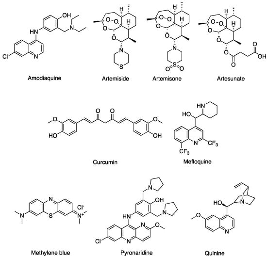 The drugs selected for examination included artemisinins, quinine and analogues and other compounds known to be active against malaria (Figure 1). Amodiaquine is active against other coronaviruses [] and, in combination with nelfinavir, is active against SARS-CoV-2 []. Artemisinins including artesunate and the newer amino-artemisinins, artemiside and artemisone [], are prepared by synthetic modification of the parent drug, artemisinin, obtained from the sweet wormwood Artemisia annua that has been used in Chinese traditional medicine for treating fevers. Artemisinins are shown to reduce the production of SARS-CoV-2 proteins, block infection at post entry level and interfere with the RBD [,]. More recently, artesunate has been selected for a Phase III study in COVID-19 patients, essentially based on its anti-inflammatory, rather than virucidal, properties (WHO Solidarity Trial, https://www.isrctn.com/ISRCTN18066414, accessed on 15 September 2021). Curcumin is a well-known bioactive natural product that acts against different targets [,,,]. According to virtual screening, it has the potential of targeting the ACE2-RBD assembly []. Methylene blue is approved by the FDA for the treatment of methemoglobinemia and is an active antimalarial drug. The compound prevents the interaction of S1 with ACE2 and consequently inhibits viral entry []. Mefloquine, quinine and pyronaridine display antiviral activity against SARS-CoV-2 in vitro [,]. The activity of pyronaridine against SARS-CoV-2 has also been evaluated by measuring its interaction with the RBD by microscale thermophoresis [,].