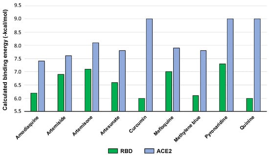Antimalarial drugs were among the first to be selected for repurposing as drugs against SARS-CoV-2 [], for which different mechanisms, such as the inhibition of endocytic pathways by elevation of endosomal pH and the interference of ACE2 with glycosylation have been proposed []. In this respect, activities of chloroquine and other antimalarial drugs such as artemisinins have been reported [,,], although the efficacy of chloroquine is debatable []. In the current study, the interaction of natural and synthetic compounds with antimalarial activity with the RBD and ACE2 are examined.