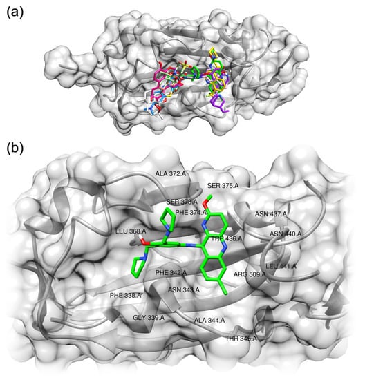 Interestingly, the compounds interact with the same site of the RBD and thus form a single cluster (Figure 3, Figures S1–S9 in the Supplementary Material). This region of the RBD includes the 340–510 residues. According to the docking results, pyronaridine interacts with some hydrophobic residues (Phe342, Ala344, Ala372, Phe374 and Leu441) and also with several polar amino acids (Asn343, Thr345, Ser373, Ser375, Trp436, Asn437, Asn440 and Arg509, Figure 3b and Figure S8 in the Supplementary Material).