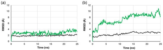 MD simulations for the complexes of pyronaridine with (a) RBD and (b) ACE2 obtained from docking experiments. Root mean square deviation (RMSD) is depicted in green for the ligand and in dark grey for the protein.