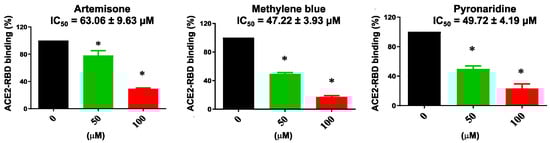 Results of ELISA experiments demonstrating that pyronaridine, artemisone and methylene blue inhibit the binding of RBD to ACE2 (* p < 0.05, compared with control group).