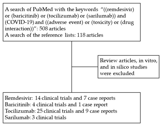 We reviewed the US FDA COVID-19 information on regulated products and consulted Micromedex® Solutions Drugs Interactions as well as Lexicomp® Drug Interactions for COVID-19 therapies. We conducted a search of PubMed for articles with the keywords “((remdesivir) or (baricitinib) or (tocilizumab) or (sarilumab)) and (COVID-19) and ((adverse event) or (toxicity) or (drug interaction))”. Reference lists of all identified studies were also searched.