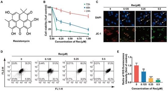 Resistomycin suppressed proliferation and decreased mitochondrial membrane potential (MMP) of HepG2 cells. (A) Structure of resistomycin. (B) Resistomycin exerted its anti-proliferative effect in a dose- and time-dependent manner when HepG2 cells were treated with resistomycin for 24 h, 48 h and 72 h and cell viability was determined using the MTT assay. (C) The results of DAPI and JC-1 staining after HepG2 cells were treated with different concentrations of resistomycin in 24 h. Arrow: apoptotic body in DAPI staining. JC-1: red fluorescence represents high mitochondrial membrane potential forming aggregates, green fluorescence represents low mitochondrial membrane potential forming monomers. Scale bar: 10000 μm (DAPI and JC-1). (D,E) Assay of flow cytometry showing the proportion of FL2-H to FL1-H in HepG2 cells treated with 0–0.5 μM resistomycin for 24 h. ** p < 0.01 and *** p < 0.001 versus 0 μM resistomycin.