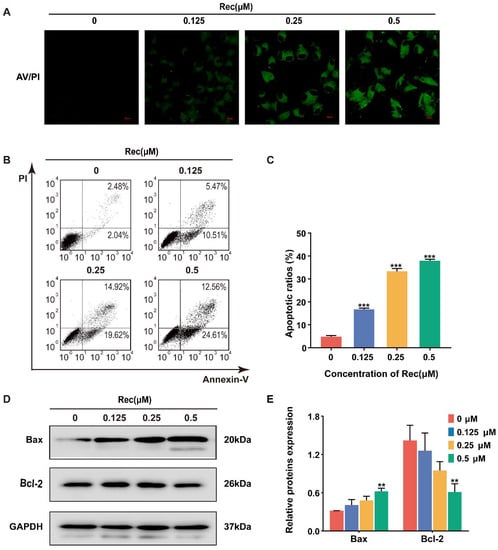 Resistomycin induced apoptosis in HepG2 cells. (A) The results of Annexin V/PI staining after HepG2 cells were treated with different concentrations of resistomycin in 24 h. Green fluorescence represents apoptotic cells. Scale bar: 20 μm. (B,C) Number and percentage of apoptotic cells measured by flow cytometry with 0, 0.125, 0.25 and 0.5 μM resistomycin for 24 h. (D,E) Western blot analysis showing decreased pro-apoptotic protein Bax and increased anti-apoptotic protein Bcl-2. ** p < 0.01 and *** p < 0.001 versus 0 μM resistomycin.