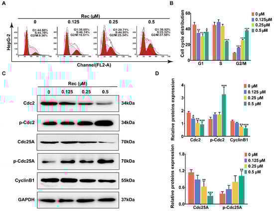 Resistomycin caused G2/M phase arrest in HepG2 cells. (A,B) Flow cytometry analysis of the distribution of HepG2 cells in the G1, S and G2 phases after treatment with 0, 0.125, 0.25 and 0.5 μM resistomycin for 24 h (each phase presented as G1-S-G2/M: red-stripes-red). (C,D) Western blot analysis showing that resistomycin downregulated the expression of Cdc25A, Cdc2 and Cyclin B1 and upregulated the expression of p-Cdc2 and p-Cdc25A after treatment with 0, 0.125, 0.25 and 0.5 μM resistomycin for 24 h. * p < 0.05, ** p < 0.01 and *** p < 0.001 versus 0 μM resistomycin.