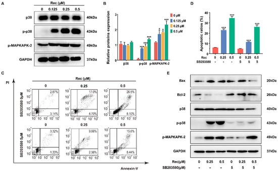 Resistomycin induced apoptosis by activating p38 MAPK signaling in vitro, which was impeded by using SB203580, an inhibitor of p38 MAPK. (A,B) The expression changes in the p38 MAPK pathway in HepG2 cells were triggered by resistomycin treatment for 24 h and relative protein expressions were detected via western blotting. (C,D) Flow cytometry analysis of the numbers and percentage of apoptotic cells treated with resistomycin for 24 h after 5 μmol/L SB203580 was added to the HepG2 cells. (E) HepG2 cells pre-treated with or without 5 μM SB203580 for 1 h and exposed to various concentrations of resistomycin for another 24 h, then analyzed by western blotting to measure the alteration of relative protein expressions. * p < 0.05 and *** p < 0.001 versus 0 μM resistomycin.