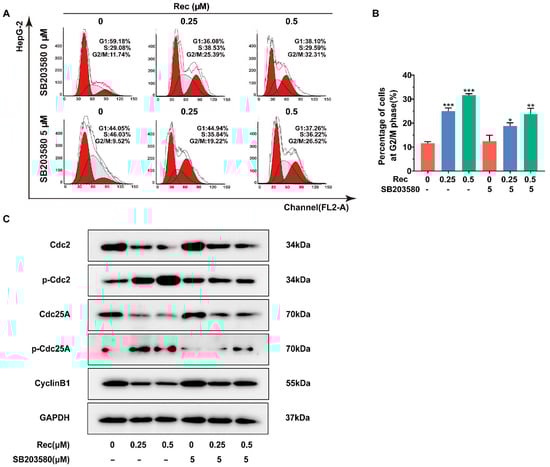 The p38 MAPK inhibitor SB203580 suppressed cycle arrest induced by resistomycin in HepG2 cells. (A,B) The ratios of G2/M phase cells treated with resistomycin (with or without 5 μM SB203580) were detected by flow cytometry (each phase presented as G1-S-G2/M: red-stripes-red). (C) HepG2 cells pre-treated with or without 5 μM SB203580 for 1 h and exposed to various concentrations of resistomycin for another 24 h, then analyzed by western blotting to measure the alteration of proteins related to cell cycle arrest. * p < 0.05, ** p < 0.01 and *** p < 0.001 versus 0 μM resistomycin.