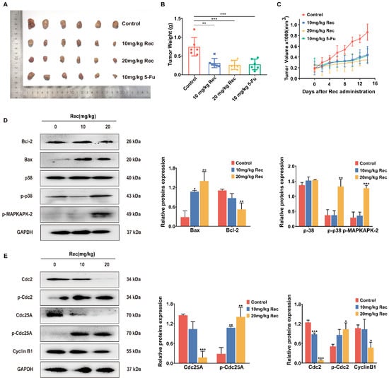 Resistomycin resulted in apoptosis and G2/M phase arrest by activating p38 MAPK signaling in vivo. (A) Images of transplanted HepG2 tumors treated with solvent, resistomycin (10 and 20 mg/kg) and 5-Fu (10 mg/kg). (B) Tumor weight changes with treatment. (C) Curve of tumors indicating that resistomycin effectively controls the growth of xenograft tumors. (D) Relative protein expression related to apoptosis, cell cycle arrest and the p38 MAPK pathway in HepG2 tumors. * p < 0.05, ** p < 0.01 and *** p < 0.001 versus 0 mg/kg resistomycin.