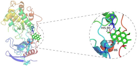 AutoDockTools software was employed to obtain the optimal docking model of resistomycin to the p38, and the resulting image is a panoramic view of the optimal binding method (Purple dotted line: hydrogen-bond). The lowest binding energy configuration is −6.92 kcal/mol.
