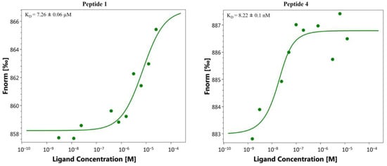 MST screening of the 10 compounds was performed as detailed in the Materials and Methods section (Section 3), and results are reported in Table 1. Analysis revealed that all peptides interact with HA with different dissociation constants. In particular, compound 4 binds HA with higher efficiency with respect to 1 (Figure 2), showing an equilibrium dissociation constant (KD) value of 8.22 ± 0.1 nM and 7.26 ± 0.06 µM, respectively. MST binding curves of peptides 2, 3 and 5–10 are reported in the Supplementary Materials (Figures S16–S19).