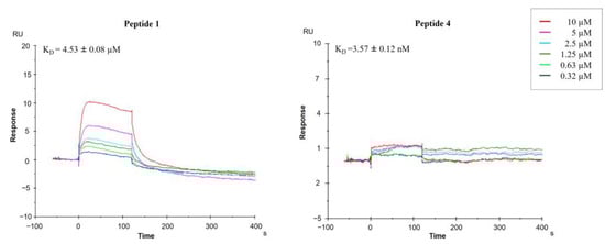 Sensorgrams obtained from the SPR interaction analysis of peptides 1 and 4 binding to immobilized HA (H1N1 hemagglutinin, Cat No: Z03181, GenScript, NE). Each compound was injected at six different concentrations (0.32, 0.63, 1.25, 2.5, 5 and 10 μM). The equilibrium dissociation constants (KD) were derived from the ratio between kinetic dissociation (koff) and association (kon) constants.