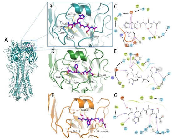 Docked poses of peptide 4 (purple C atoms, represented as sticks) in the RBS of studied HAs represented as cartoons. (A) Total view of Parma/H1N1 (deep-cyan HA1 chains, pale cyan HA2 chains); zoomed view of: (B) Parma/H1N1 (deep cyan); (D) Roma/H1N1 (dark green); (F) Parma/H3N2 (orange). Residues involved in H-bond interactions with the ligand are represented as lines; H-bonds are depicted as yellow dashed lines. Corresponding 2D ligand interaction diagrams are reported in panels (C,E,G); in these latter diagrams, residues close to the ligand are colored on the basis of their properties (orange, negatively charged; blue, positively charged; green, hydrophobic; cyan, polar), H-bonds are depicted as magenta arrows, solvent-exposed atoms are surrounded by a gray shadow.