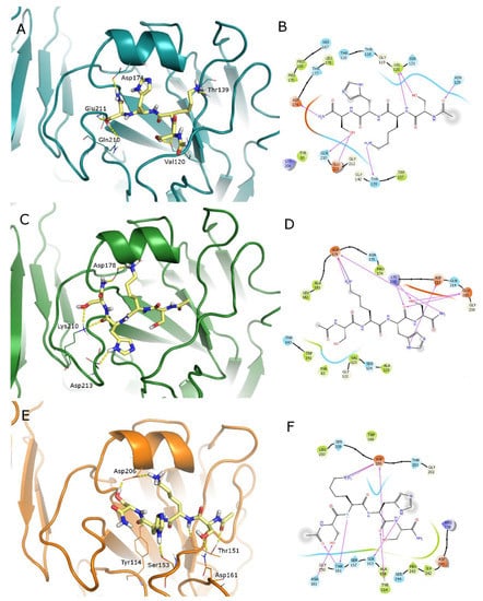 Docked poses of peptide 1 (yellow C atoms, represented as sticks) in the RBS of studied HAs represented as cartoons: (A) Parma/H1N1 (deep-cyan); (C) Roma/H1N1 (dark green); (E) Parma/H3N2 (orange). Residues involved in H-bond interactions with the ligand are represented as lines; H-bonds are depicted as yellow dashed lines. Corresponding 2D ligand interaction diagrams are reported in panels (B,D,F); in the diagrams, residues close to the ligand are colored on the basis of their properties (orange, negatively charged; blue, positively charged; green, hydrophobic; cyan, polar), H-bonds are depicted as magenta arrows, solvent-exposed atoms are surrounded by a gray shadow.