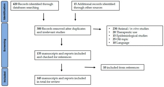 A literature search was conducted on multidisciplinary research databases such as PubMed, Scopus, and Web of Science and international agencies or institutional websites including the WHO, UNODC, Centers for Disease Control (CDC), U.S. Department of Justice, US FDA, US Drug Enforcement Administration (DEA), US National Institute of Health (NIH), EMCDDA, and European Medicines Agency (EMA) to identify the most relevant literature. The search terms used alone or in combination were: “synthetic cannabinoids”, “Cannabis sativa”, “Schedule 1 drugs”, “phytocannabinoids”, “spice”, “K2” “cannabinoids”, “electronic cigarettes”, “adverse effects”, “cloud 9”, “Bath salts”, “mojo”, “John William Huffman (JWH)”, “Hebrew University (HU)”, “EMCDDA”, “MDMB-4en-PINACA”, “4F-MDMB-BICA”, “toxic effects” and “herbal incense”. Only the articles written in English were selected. All the articles were reviewed independently by the authors to determine their relevance in the framework of the current study. Details of the literature search are listed in Figure 1.