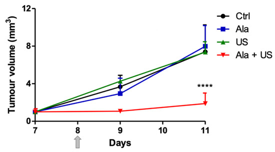 Foglietta, F.; Gola, G.; Biasibetti, E.; Capucchio, M.T.; Bruni, I.; Francovich, A.; Durando, G.; Serpe, L.; Canaparo, R. 5-Aminolevulinic Acid Triggered by Ultrasound Halts Tumor Proliferation in a Syngeneic Model of Breast Cancer. Pharmaceuticals 2021, 14, 972. https://doi.org/10.3390/ph14100972