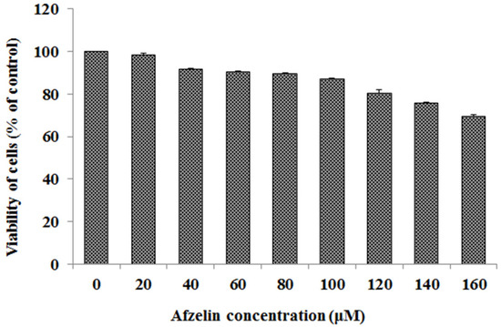 Viability of gastric cancer CRL-1739 cells (AGS) treated for 24 h with 20–160 μM concentration of afzelin. Mean values ± SD are the mean of triplicate culture.