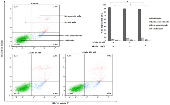 Flow cytometry determination of AGS cancer cells after 24 h incubation with 60 μM and 120 μM afzelin and subsequent staining with Annexin V and propidium iodide. The data are presented as mean percentages from 3 independent experiments done in duplicate. * p < 0.05, compared to the untreated control.