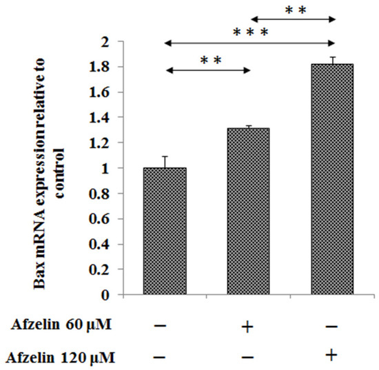 The effect of afzelin on pro-apoptotic Bax mRNA expression in AGS gastric cancer cells. The cells were incubated for 24 h with 60 and 120 μM afzelin. mRNA was determined by RT-PCR. The results are presented as a relative fold change in mRNA expression of gene in comparison of gene in control where expression was set as 1. ±SD are the mean of triplicate cultures. ** p < 0.01, *** p < 0.001.