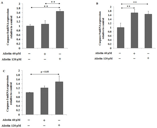 mRNAs of two initiatory caspases -8 and -9 and executive caspase-3 were determined. Caspase-8 expression was significantly stimulated, by about 60%, after 120 μM afzelin action. Lower flavonoid concentration had no effect on caspase-8 mRNA (Figure 5A). In case of caspase-9 almost the same, 60% increase of expression was observed after both afzelin doses (Figure 5B). The 120 μM afzelin also stimulated caspase-3 expression by about 50% in comparison with untreated control (Figure 5C).