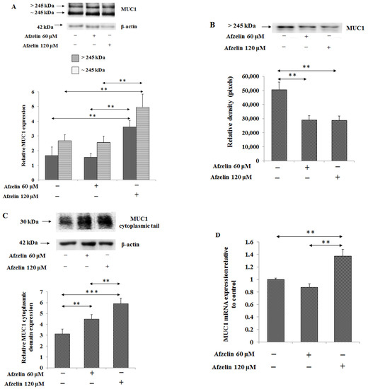 The extracellular domain of MUC1 mucin present in gastric cancer cell lysates and culture medium was differently affected by afzelin. The flavonoid with 120 μM concentration significantly increased expression of two extracellular MUC1 subunits in cell lysates: subunit with ~245 kDa molecular mass increased by over 100% and band higher than 245 kDa increased by about 80% compared to untreated cells (Figure 6A, supplementary Figure S1). The expression of the over 245 kDa extracellular mucin domain released to the culture medium revealed a significant decrease, about 42%, after treatment of the cells with both concentrations of the flavonoid in comparison to control (Figure 6B, supplementary Figure S1). Cytoplasmic domain of MUC1 with 30 kDa molecular mass was significantly increased by afzelin treatment, in concentration dependent manner by 43 and 88%, respectively (Figure 6C, supplementary Figure S1). It was also found that 120 μM afzelin exerted by 37% stimulatory effect on MUC1 mRNA expression (Figure 6D).