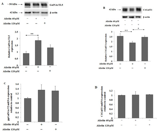 Tn and T antigens are typical carbohydrate cancer antigens present on MUC1. GalNAcTL5 is the enzyme participating in Tn antigen formation at the initiation of O-linked glycosylation. In Figure 7A (and supplementary Figure S2) stimulatory effect of 60 μM afzelin, by about 100%, on GalNAcTL5 protein expression is presented. T antigen is formed by Gal addition to Tn antigen in the reaction catalyzed by C1GalT1. 60 μM afzelin significantly inhibited the enzyme protein expression by 27%. (Figure 7B, supplementary Figure S2). The expression of enzymes responsible for Tn and T antigens formation was also checked on the mRNA level. However, no significant effect of afzelin on ppGalNAcT2 and C1GalT1 mRNAs was observed (Figure 7C,D).