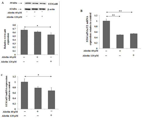 Effect of afzelin on the expression of enzymes participating in sialyl Tn and sialyl T antigens formation in AGS gastric cancer cells treated with 60 or 120 μM afzelin. Expression of ST3GalII (A) in cell lysates was measured using Western blot analysis. The β-actin expression served as protein loading control. The bands intensity was quantified by densitometry. Data are presented as the mean ± SD from 3 assays. * p ˂ 0.05; ST6GalNAcT2 (B) and ST3GalT1 (C) gene expressions were assessed by RT-PCR. The results are expressed as a relative fold change in ST6GalNAcT2 and ST3GalT1mRNA expression in comparison to control where expression was set as 1. ±SD are the mean of triplicate cultures. * p ˂ 0.05; ** p ˂ 0.01.