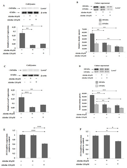Effect of afzelin on Lewisa and Lewisb antigen expression as well as enzymes participating in these antigens’ formation in AGS gastric cancer cells treated with 60 and 120 μM afzelin. Western blotting was used to determine Lewisa (A,B) and Lewisb (C,D) structures in cell lysates and culture medium. The β-actin expression served as protein loading control. The bands intensity was quantified by densitometry. Data are presented as the mean ± SD from 3 assays. * p ˂ 0.05; ** p ˂ 0.01; *** p ˂ 0.001. FUT3 (E) and FUT4 (F) gene expressions were assessed by RT-PCR. The results are shown as a relative fold change in FUT3 and FUT4 mRNA in comparison to control where expression was set as 1. ±SD are the mean of triplicate cultures. * p ˂ 0.05; *** p ˂ 0.001.