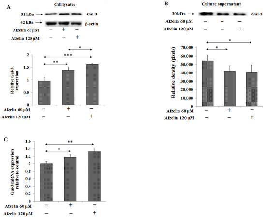 Gal-3 is β-galactoside-binding protein, distributed inside and outside of the cell. MUC1 mucin with TF antigen can be one of possible ligands for Gal-3. In the current study, a significant, concentration dependent increase of Gal-3 expression in cells lysates was revealed, by 45 and 69% for 60 and 120 μM afzelin, respectively (Figure 10A, supplementary Figure S5). On the contrary, decreased expression of Gal-3 protein in culture medium by about 30% without relation to flavonoid concentration was observed (Figure 10B, supplementary Figure S5). Gal-3 mRNA was significantly stimulated by 17% after 60 μM and by 32% after 120 μM afzelin treatment (Figure 10C).