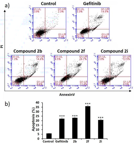 Flow cytometric analysis to determine apoptosis in MDA-MB-468 cells. (a) The cells were treated with 10 μM of gefitinib, and compound 2b, 2f, and 2i, respectively, for 24 h. (b) Fluorescence-activated cell sorting (FACS) analysis of propidium iodide (PI) uptake and annexin V binding in non-permeabilized cells (lower-left, live cells; lower-right, early apoptotic cells; upper-right, late apoptotic cells; upper-left, necrotic cells). The quantification of apoptotic cells from three independent experiments. (*** p < 0.001, compared with control cells).