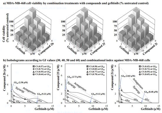 Combinational treatment with gefitinib and compounds (2b, 2f and 2i), and their isobolograms. (a) MDA-MB-468 cell viability by combination treatments with compounds and gefitinib (% untreated control); (b) isobolograms according to GI values (30, 40, 50 and 60) and combinational index against MDA-MB-468 cells.