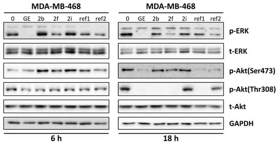 To gain a better insight into the mechanisms underlying the activity of these compounds, the inhibitory effects of compounds 2b, 2f, and 2i were tested and compared with gefitinib (GE), compound Ref 1, and Ref 2 in the downstream signaling pathway of EGFR in MDA-MB-468 cells, as an EGFR-overexpressed basal-like breast cancer cell line.