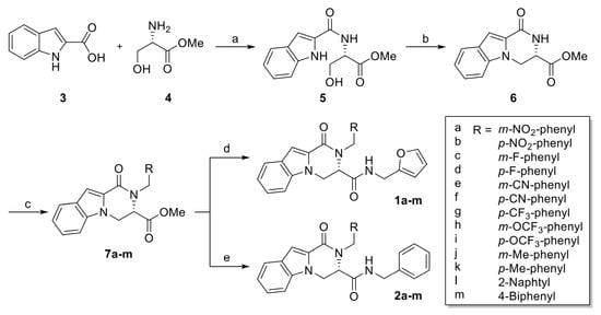 The concise four-step synthetic procedure is described in Scheme 1 based on a previously reported study [40] for the synthesis of furfuryl and benzyl 2-(substituted arylmethyl)-1-oxo-1,2,3,4-tetrahydropyrazino[1,2-a]indole-3-carboxamide (series 1 and 2, respectively). Intermediate 5 with an (S)-configuration was prepared in 98% yield under EDC peptide-coupling conditions with HOBt (1-hydroxybenzotriazole), and trimethylamine in CH2Cl2 from commercially available starting materials, indole-2-carboxylic acid (3), and L-serine methyl ester (4). Through an intramolecular Mitsunobu reaction using diethyl diazenedicarboxylate (DEAD) and triphenylphosphine in tetrahydrofuran, compound 6, with a pyrazino[1,2-a]indole ring with (S)-configuration, was synthesized in 54% yield from compound 5, based on a previous study [40]. To prepare methyl (S)-2-(substituted arylmethyl)-1-oxo-1,2,3,4-tetrahydropyrazino[1,2-a]indole-3-carboxylate analogs (7a–m), compound 6 was alkylated at the N2-position of the pyrazino[1,2-a]indole ring with various arylmethyl halides and K2CO3 in 26–58% yield. Finally, twenty-six targeted furfuryl or benzyl 2-(substituted arylmethyl)-1-oxo-1,2,3,4-tetrahydropyrazino[1,2-a]indole-3-carboxamide analogs (1a–m and 2a–m) were prepared by direct transamidation from methyl esters (7a–m) with furfurylamine and benzylamine, respectively, in 28–88% yield. All target compounds were identified by 1H NMR, 13C NMR, and HRMS (see Supplementary Materials).