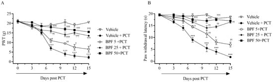 Recently, we demonstrated that BPF administration inhibits the onset of neuropathic pain [39] and morphine-induced tolerance and hyperalgesia model [28]. In this study, we observed that intraperitoneal administration of BPF (25 mg/Kg), 15 min before paclitaxel administration, modified nociceptive parameters as follows: A significant enhancement in the mechanical and thermal threshold were produced in the presence of BPF starting from D7 up to D15 post PCT administration. (Figure 1A,B).
