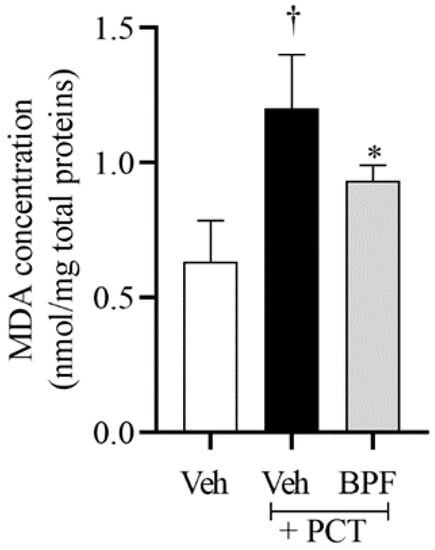 The development of neuropathic pain is associated with both activation of NOS enzymes and NADPH oxidase, and the production of superoxide (SO) in the spinal cord of rats [25]. The activation of NOS and NADPH oxidase is crucial for the biosynthesis of peroxynitrite (PN), responsible for protein nitration and formation of lipid peroxidation products, including MDA [25]. Indeed, in accordance with our previous data [25,39], we showed a significant MDA production in the spinal cord of rats that received PCT, suggesting an increase in lipid peroxidation products and oxidative stress (Figure 2). Intraperitoneal injection of BPF (25 mg/Kg), 15 min before paclitaxel injection, decreased MDA levels, demonstrating its antioxidant activity (Figure 2).