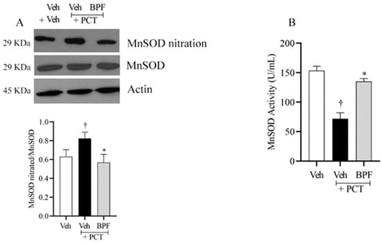 Beneficial effect of BPF on MnSOD nitration. (A) Compared to the vehicle group (Veh), animals with paclitaxel, at D15, showed nitration of manganese superoxide dismutase (MnSOD), (B) linked to the deactivation of its enzymatic function, in the L4-L5 portion of the spinal cord tissues. (A,B) BPF administration (25 mg/Kg/day; 15 min prior to each paclitaxel injection) inhibited MnSOD nitration and restored its activity in rats with paclitaxel-induced neuropathic pain. No difference in MnSOD or β-actin expression was detected among the lanes in these conditions. The gels are representative of results from six animals, and the histogram represents densitometric analyses of all animals per group. Results are expressed as mean ± SEM for six rats; †: p < 0.05 compared to Veh + Veh. *: p < 0.05 compared to Veh + PCT.