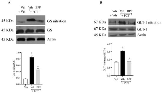 Beneficial effect of BPF on GS and GLT1 nitration. (A) Compared to the vehicle group (Veh), animals with paclitaxel, at D15, showed nitration of glutamine synthase (GS), and (B) glutamate transporter (GLT-1), in the L4-L5 portion of the spinal cord tissues. (A,B) Pretreatment with BPF (25 mg/Kg/day; 15 min prior to each paclitaxel injection) inhibited GS and GLT-1 nitration in rats with paclitaxel-induced neuropathic pain. No difference in GS, GLT-1 or β-actin expression was detected among the lanes in these conditions. The gels are representative of results from six animals, and the histogram represents densitometric analyses of all animals per group. Results are expressed as mean ± SEM for six rats; †: p < 0.001 compared to Veh + Veh. *: p < 0.001 compared to Veh + PCT.