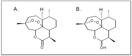 Chemical structures of artemisinin (A) and dihydroartemisinin (B).